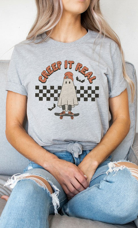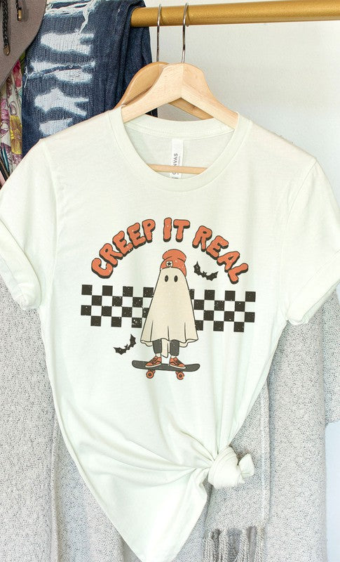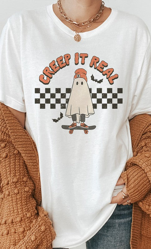 Introducing the \"Creep It Real\" Skateboard Ghost Bats PLUS SIZE Graphic Tee from Kissed Apparel. Take your B2B merchandise to the next level with this edgy and playful design. Featuring a unique combination of skateboard, ghost, and bat elements, it offers a cool and trendy aesthetic. Most t shirt colors are 52/48 cotton/poly blend. White and Cream tees are 100% cotton, Ash tees are 99/1 cotton/poly. Perfect for those who love a spooky and alternative style. Order now to enhance your business's fashion line and attract customers with this eye-catching tee.