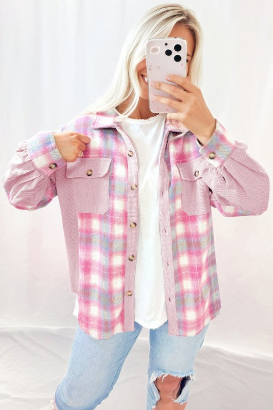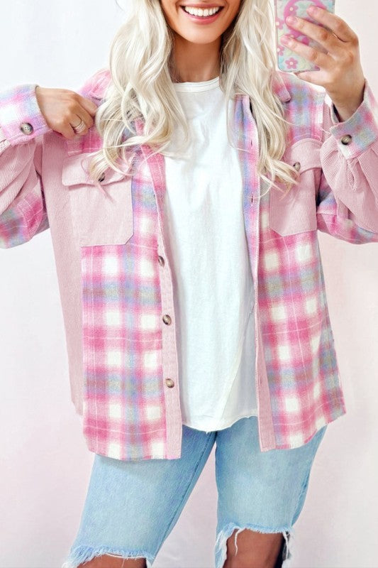 This shacket expertly blends cozy brushed fabric with classic patchwork for a refined look. The textured fabric ensures warmth and comfort, while the retro-inspired corduroy details enhance its timeless appeal. Functional pockets add practical storage without sacrificing style, making this shacket a versatile wardrobe essential for cooler days. 100% Polyester