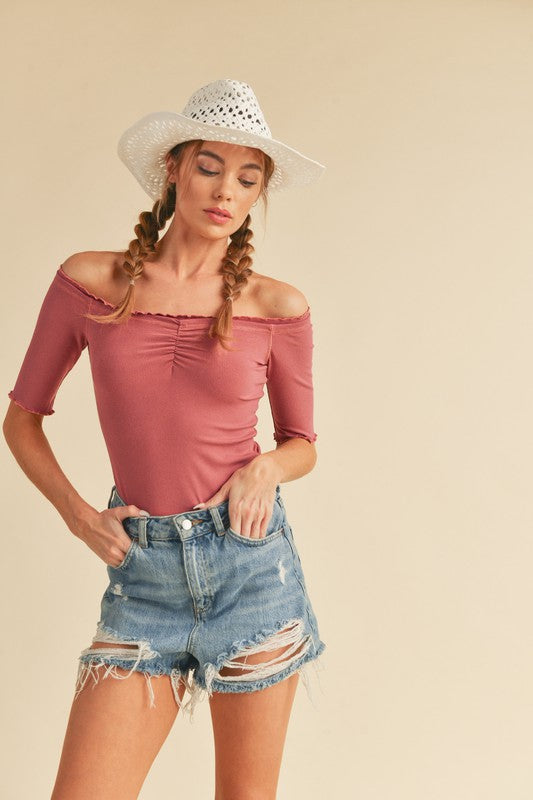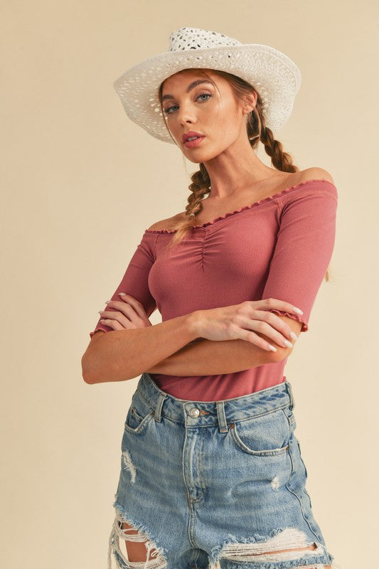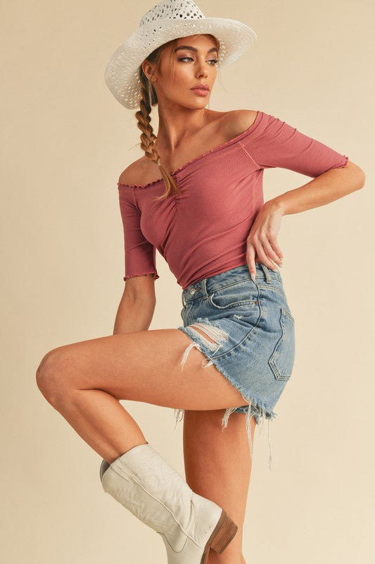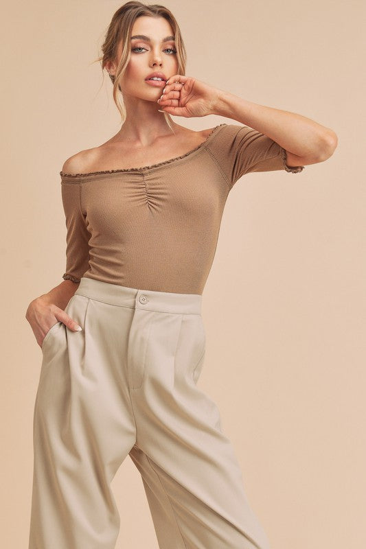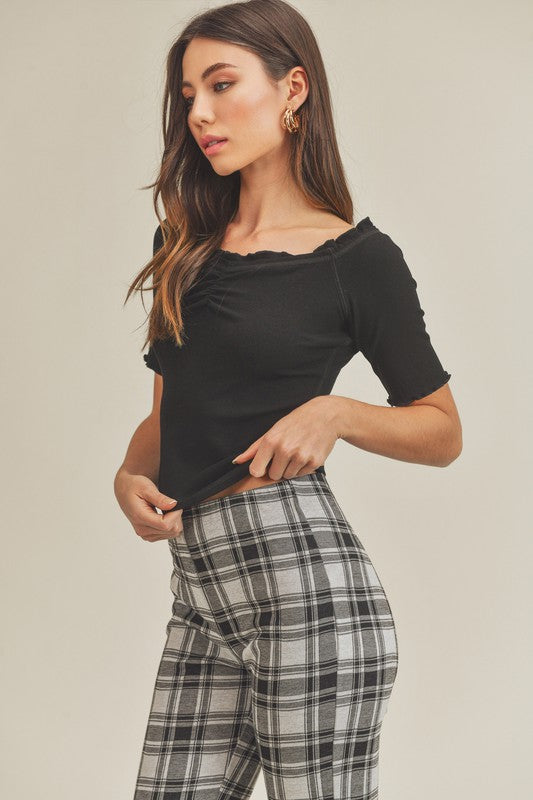 A true goes with anything Lilah Top is featured in a staple ribbed knit fabrication with ruffled sweetheart cinched neckline.