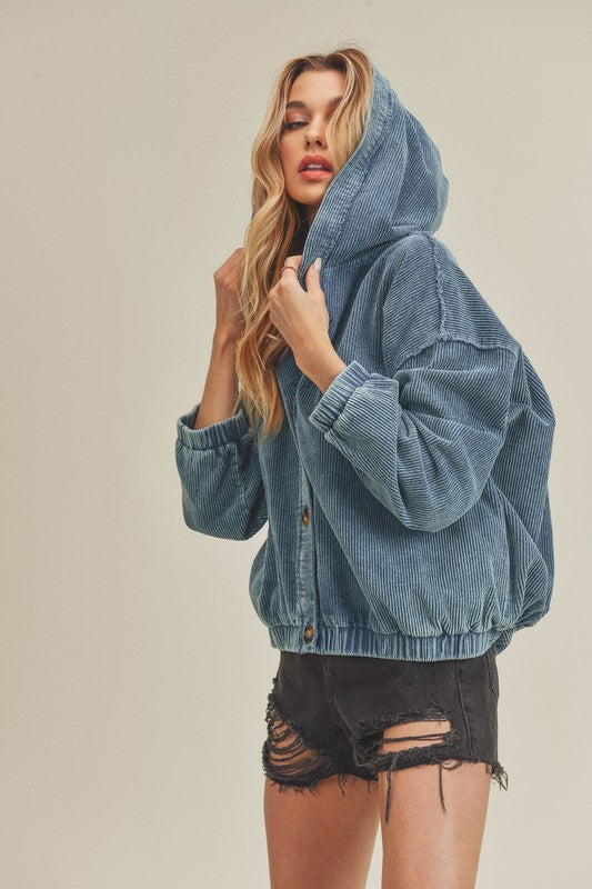 This timeless corduroy hooded button-up Nadia Jacket is a staple for this season. The garment wash gives her a perfect lived in look with an oversized silhouette that can be worn layered.