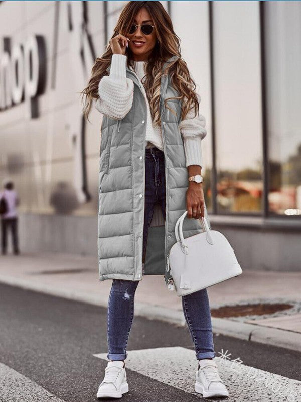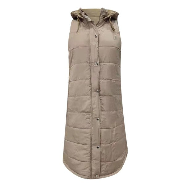 - Long Puffer Vest- Side seam pockets- Side seam zipper vents at bottom- Drawstring at hoodie- Zip front